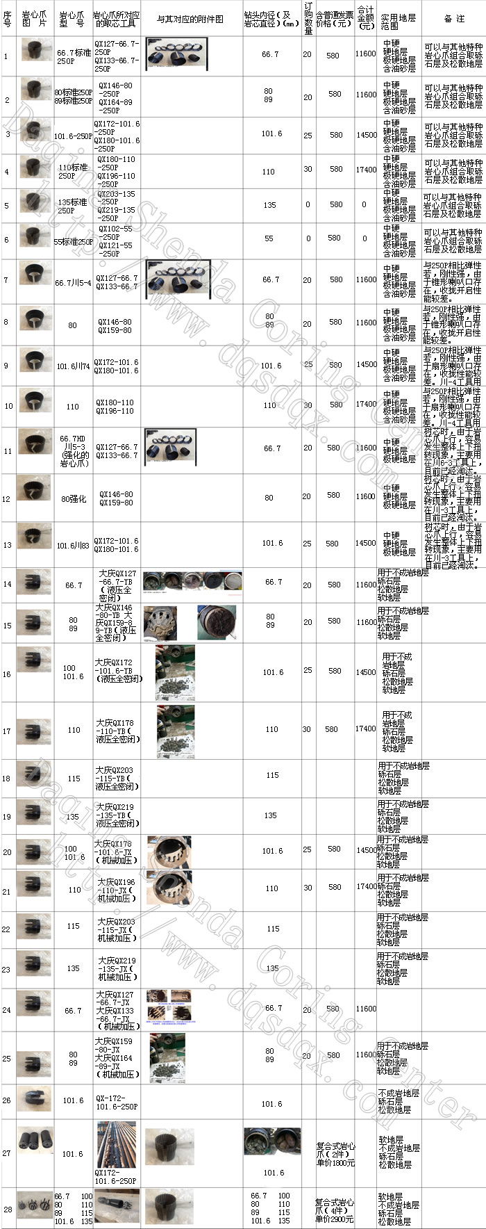 巖芯爪類型和規(guī)格